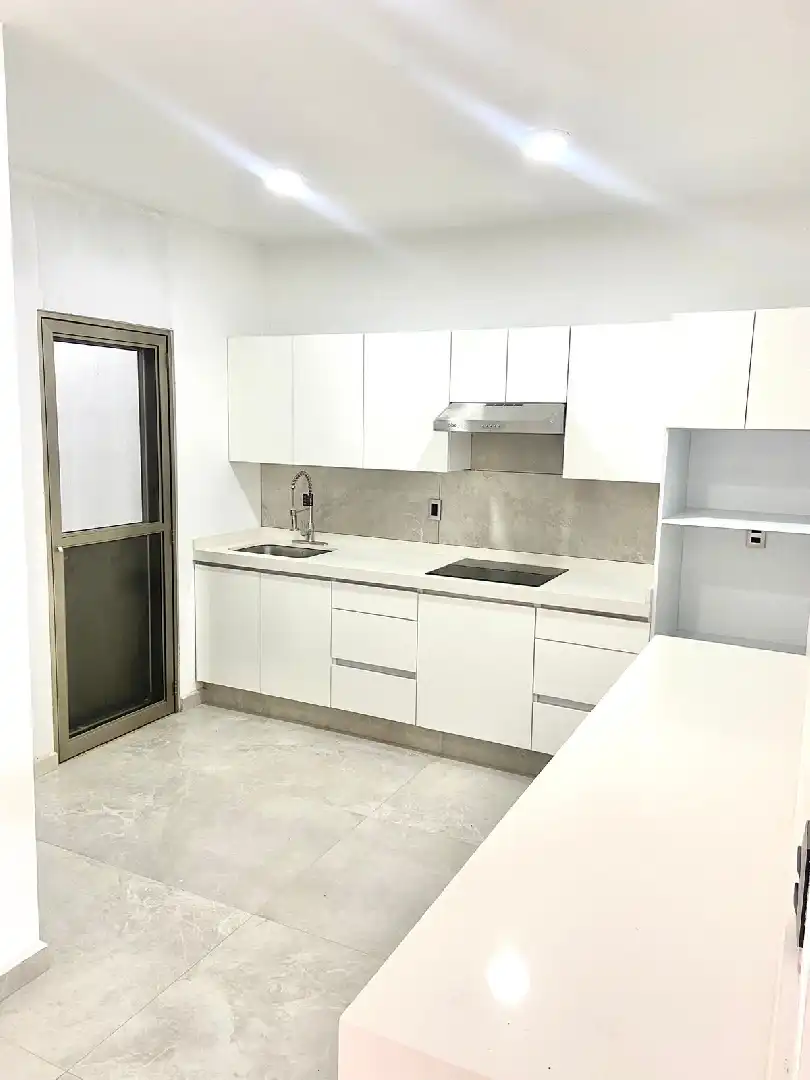 Cocina equipada con parrilla eléctrica, campana, horno y barra en cuarzo