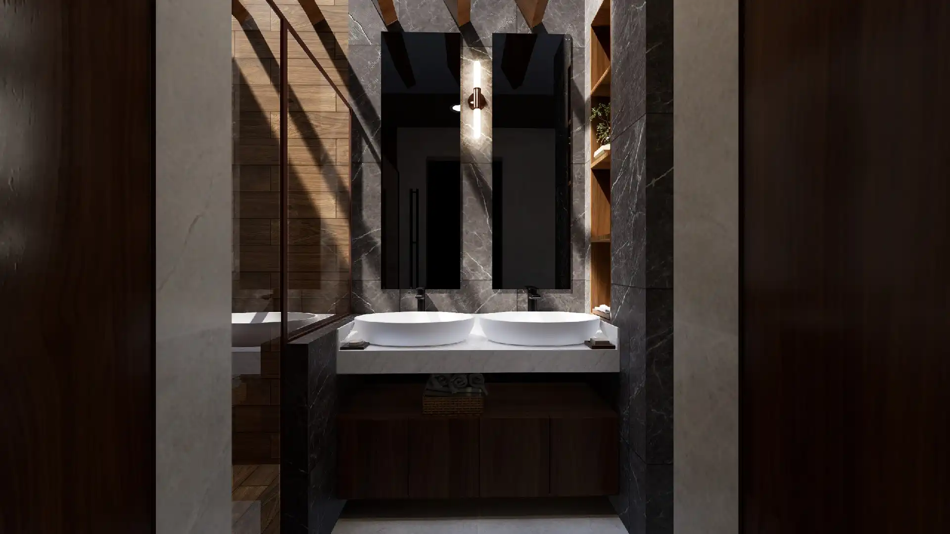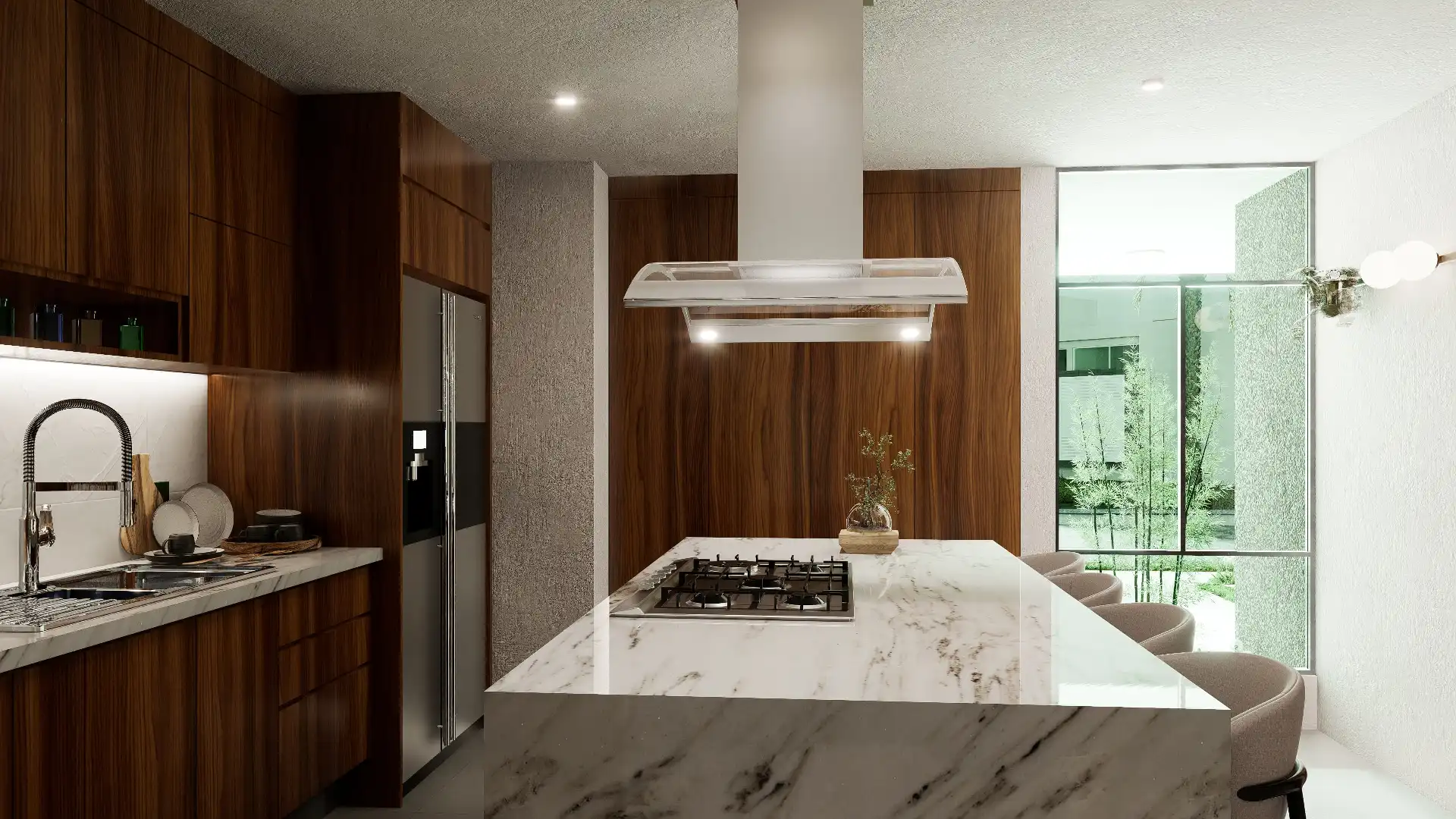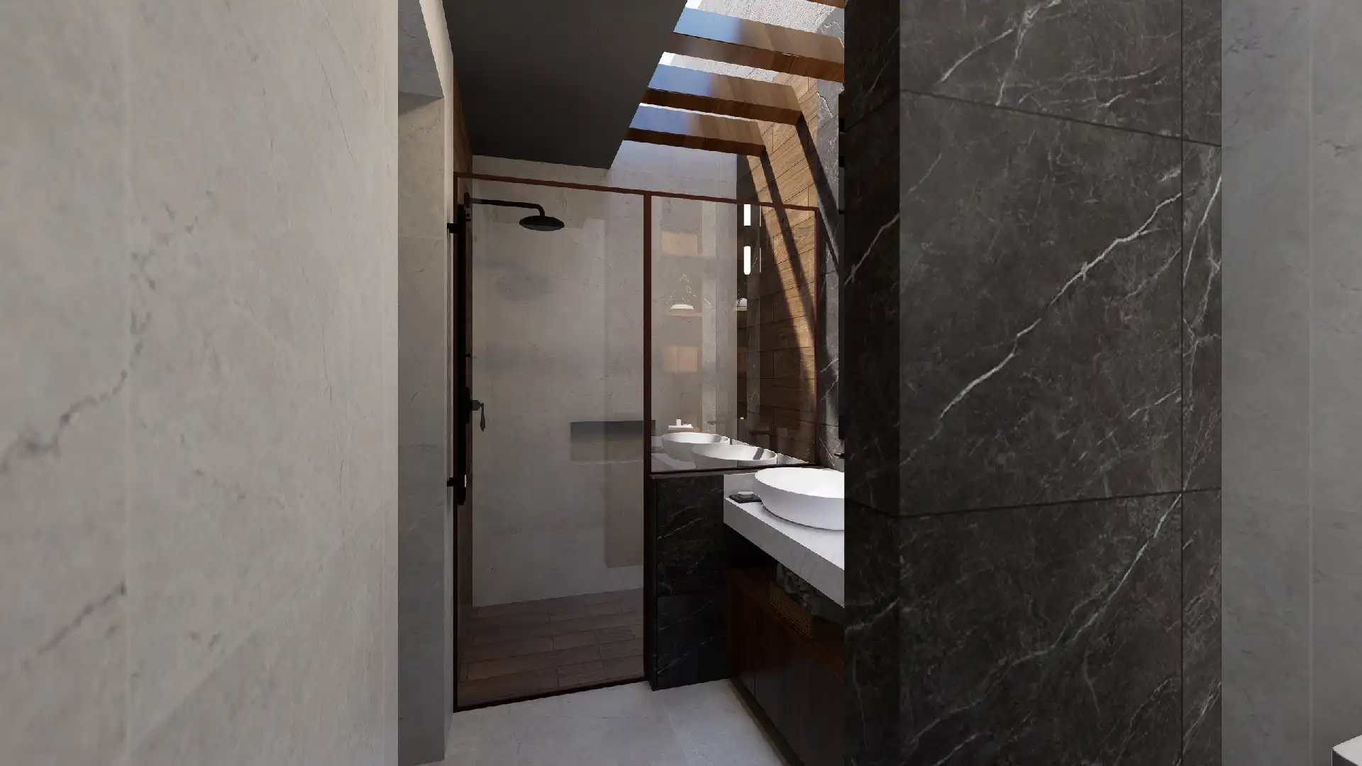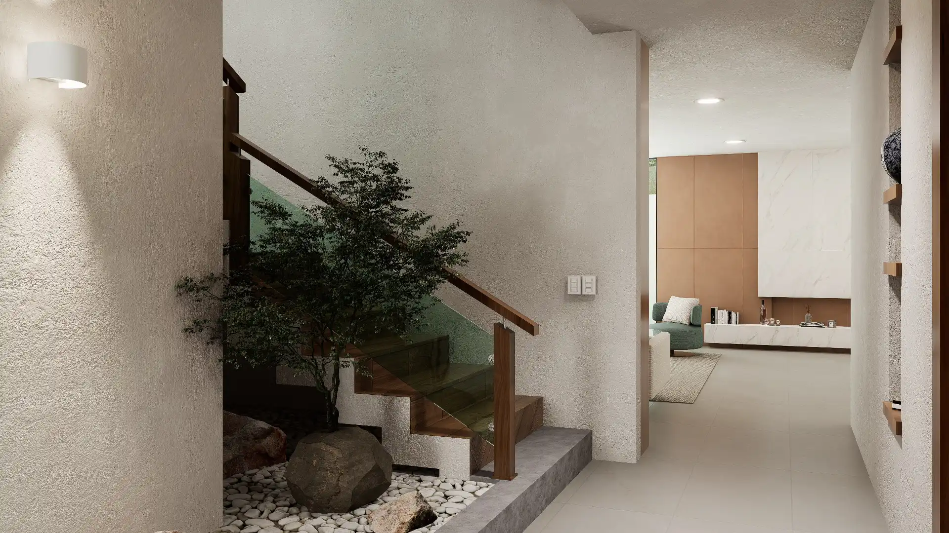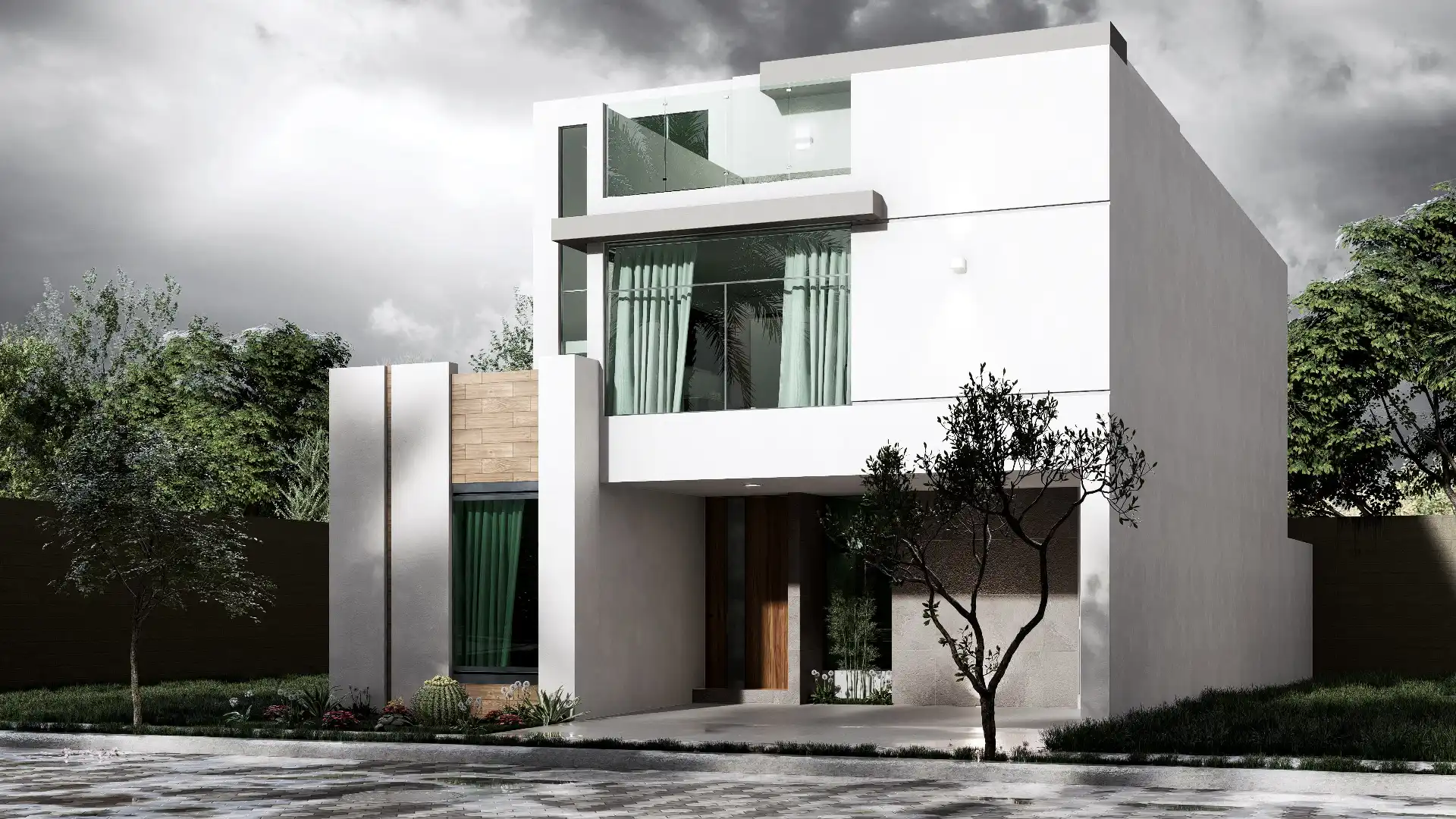 ACABADOS: Barandal de madera con cristal templado, canceles con mosquiteros, canceles de baño con cristal templado, llaves de baño marca Helvex, carpintería en parota y cedro, pisos Interceramic 60×60